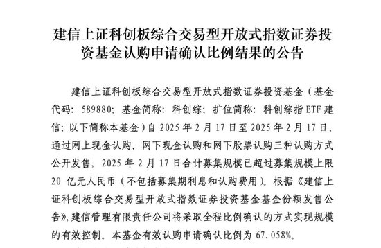 根据最新公告,建信科创综指ETF采取全程比例配售,有效认购申请确认比例67.058%。